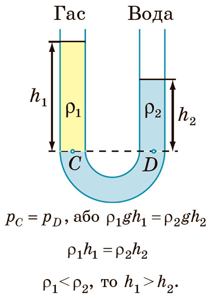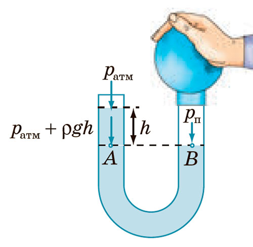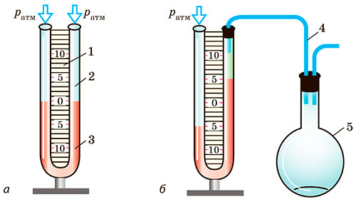 Якщо pг < pатм, то pг=pатм–ρgh; якщо pг > pатм, то pг=pатм+ρgh, де pатм — атмосферний тиск.