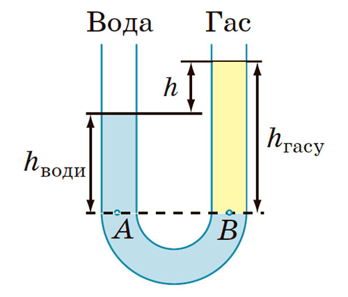 У праве коліно відкритої U-подібної трубки, яка містила воду, налили шар гасу висотою 12, 5 см (див. рисунок). Визначте різницю рівнів води і гасу в правому і лівому колінах U-подібної трубки. Гас і вода не змішуються.