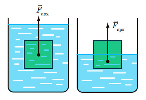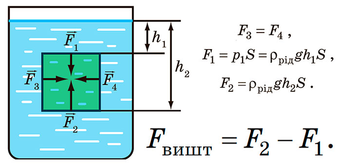 Архімедова сила дорівнює вазі рідини в об’ємі кубика.