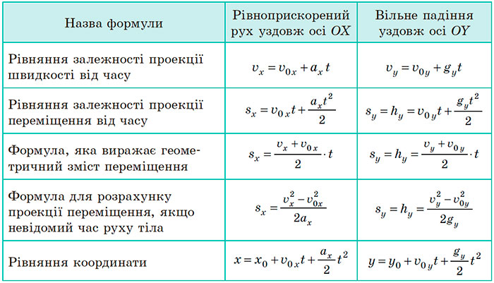 2. Запишіть основні формули, які характеризують рівноприскорений рух.