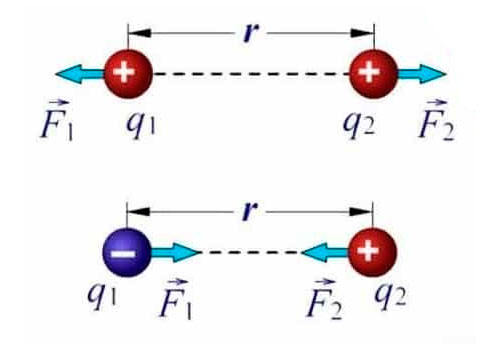 Сила F взаємодії двох нерухомих точкових зарядів q1 і q2 прямо пропорційна добутку модулів цих зарядів і обернено пропорційна квадрату відстані r між ними: