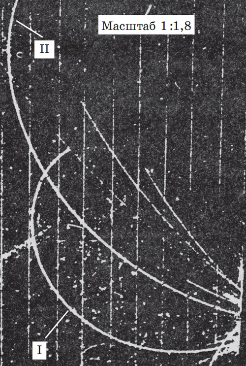 3. Тепер розгляньте уважно фотографію треків заряджених частинок, яка отримана за допомогою камери Вільсона. Вкажіть напрямок початкових швидкостей частинок І та ІІ.