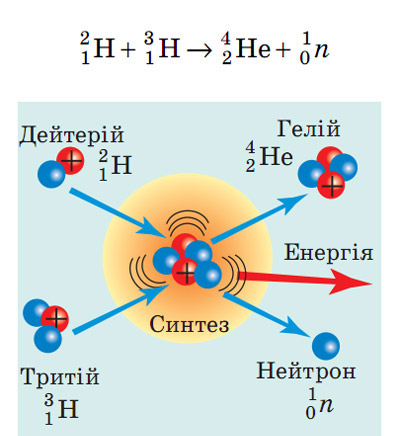 Реакцію злиття легких ядер у важчі ядра, яка відбувається за дуже високих температур (понад 107 °С) і супроводжується виділенням енергії, називають термоядерним синтезом.