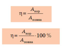 Коефіцієнт корисної дії (ККД) механізму — це фізична величина, яка характеризує механізм і дорівнює відношенню корисної роботи до повної роботи: