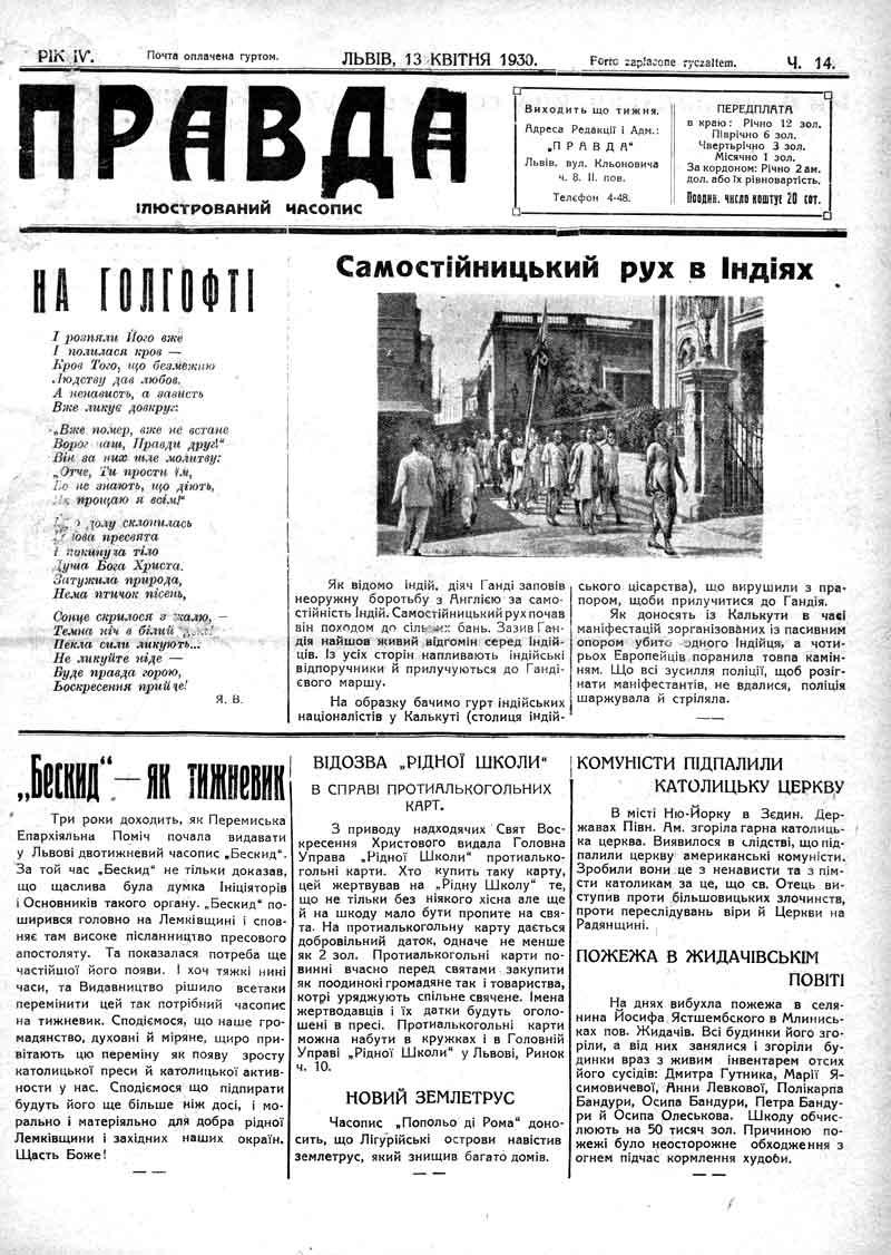 В місті Нью-Йорку в США Півн. Америка згоріла гарна католицька церква. Виявилося під час слідства, що підпалили церкву американські комуністи. Зробили вони це з ненависті та з помсти католикам за те, що св. Отець виступив проти більшовицьких злочинств, проти переслідувань віри й Церкви на Радянщині.
