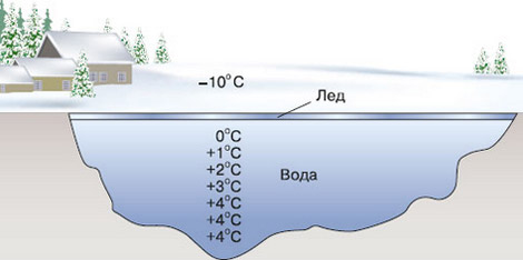 Існують речовини, об’єм яких на певному інтервалі температур під час нагрівання зменшується, а під час охолодження — збільшується. До таких речовин належать вода, чавун і деякі інші. Вода, наприклад, під час охолодження до 4 °С стискується, як і більшість речовин. Однак починаючи з температури 4 °С і до замерзання (0 °С) вода розширюється. Саме завдяки цій властивості річки, моря й океани не промерзають до дна навіть у сильні морози.