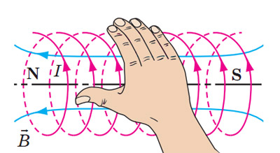 Якщо чотири зігнуті пальці правої руки спрямувати за напрямком струму в котушці, то відігнутий на 900 великий палець укаже напрямок на північний полюс котушки, тобто напрямок вектора магнітної індукції всередині котушки.