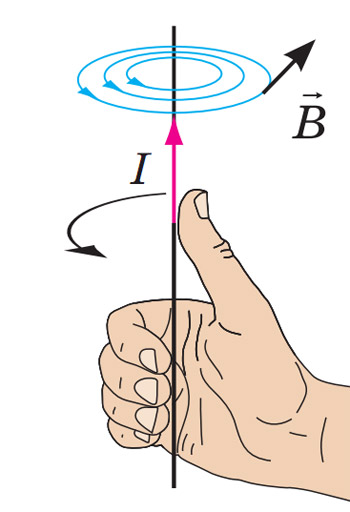 Якщо спрямувати великий палець правої руки за напрямком струму в провіднику, то чотири зігнуті пальці вкажуть напрямок ліній магнітного поля струму.