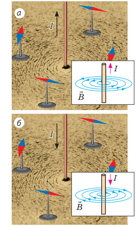 Напрямок ліній магнітної індукції магнітного поля провідника зі струмом можна визначити за допомогою магнітних стрілок або за допомогою правила свердлика.
