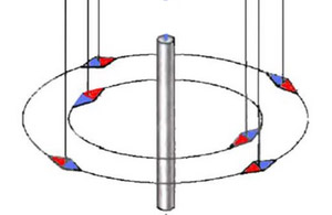 Є провідник зі струмом. Навколо нього на нитках розміщені маленькі магнітні стрілки від компасів. Вкажіть напрямки ліній магнітної індукції та сили струму в провіднику.