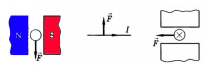 На всіх малюнках зображена сила Ампера. Зобразіть для кожного з трьох малюнків відсутні позначення: 1) напрям струму; 2) лінії магнітної індукції; 3) лінії магнітної індукції та полюси магніту.