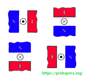 Вкажіть напрямок сили Ампера для усіх чотирьох випадків. Не забудьте намалювати ліній магнітної індукції.