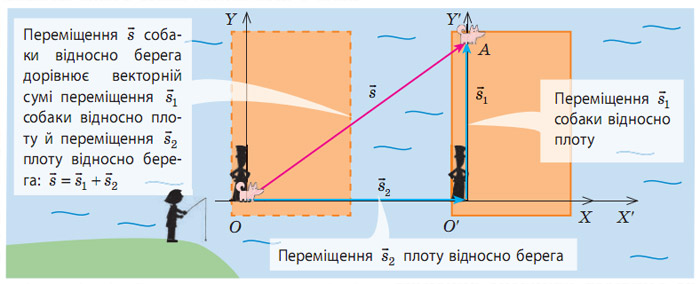 Переміщення s тіла в нерухомій системі відліку дорівнює геометричній сумі переміщення s1 тіла в рухомій системі відліку та переміщення s2 рухомої системи відліку відносно нерухомої: