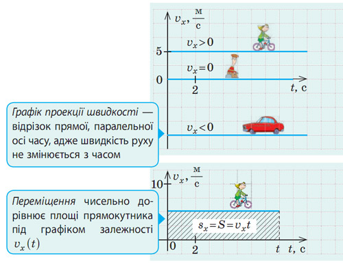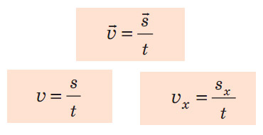 З наведених формул можна вивести формули для обчислення переміщення (скаляр, вектор та проекцію): s=v·t, sх=v·t,
