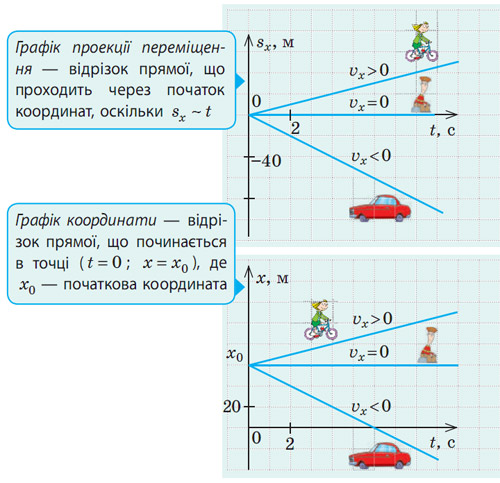 де x0 — початкова координата; vx — проекція швидкості; t — час спостереження.