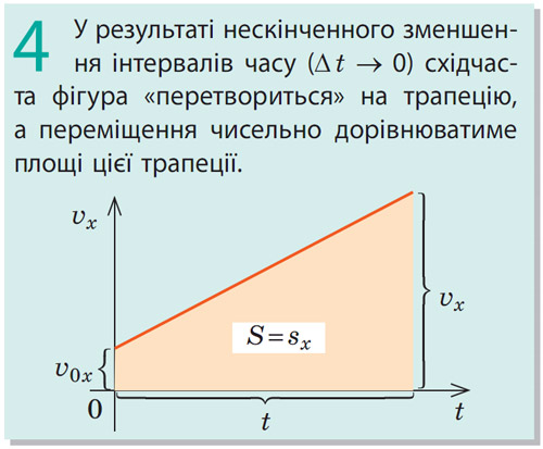Геометричний зміст проекції переміщення: переміщення тіла чисельно дорівнює площі фігури під графіком залежності проекції швидкості руху тіла від часу.