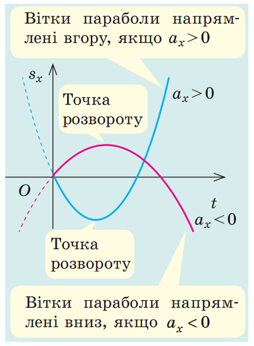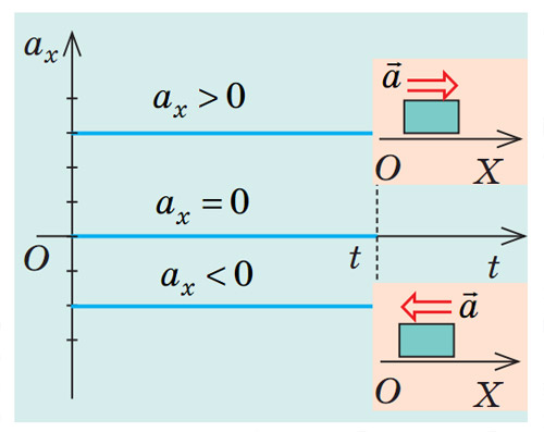 Графік проекції прискорення (графік залежності ax(t)) — відрізок прямої, паралельної осі часу.