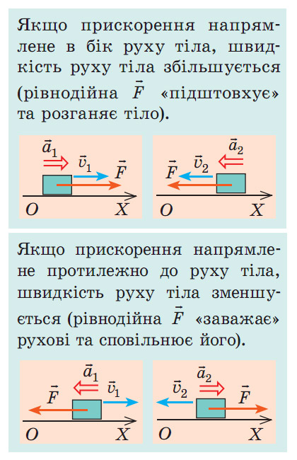 Напрямок прискорення руху тіла збігається з напрямком рівнодійної сил.
