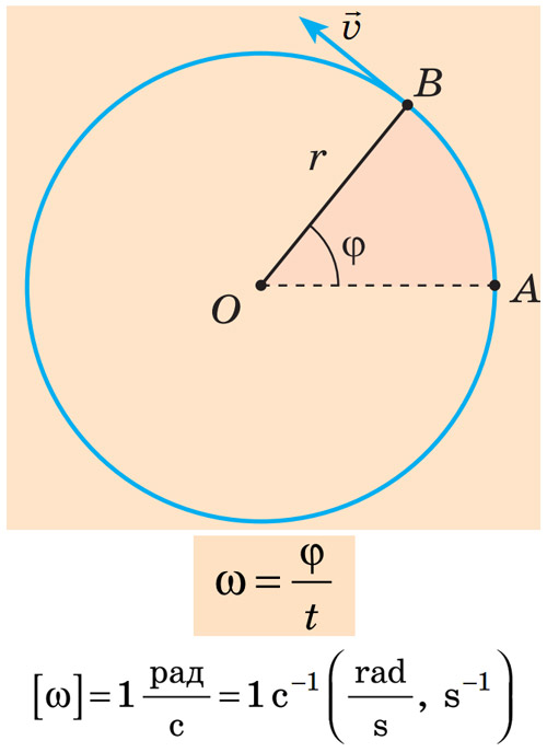 Кутова швидкість — це фізична величина, яка чисельно дорівнює куту повороту радіуса за одиницю часу: