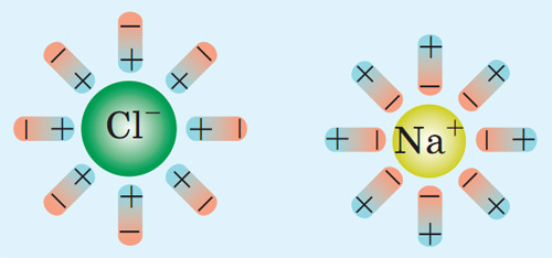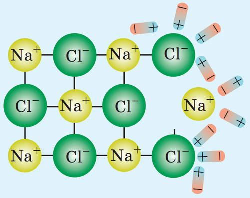Наприклад, коли кристалик кухонної солі потрапляє у воду, полярні молекули води оточують йони Натрію та йони Хлору і відокремлюють їх від кристалика.