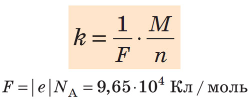 Електрохімічний еквівалент k прямо пропорційний відношенню молярної маси М елемента до валентності n цього елемента в даній хімічній сполуці: