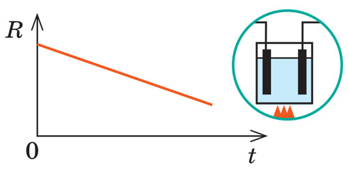 Зі збільшенням температури кількість йонів в електроліті значно збільшується, тому, опір електроліту зменшується.