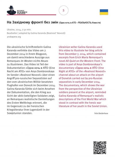Готуючись до п’ятдесятої річниці смерті письменника, організатори виставки вивчали питання поширення та відображення творчості Еріха Марії Ремарка у світі: в літературі, в живопису, в кінематографі, в ЗМІ тощо. В процесі пошуку інформації вони натрапили на публікацію від 7 грудня 2014 року - уривки з роману «На Західному фронті без змін», ілюстровану відео «Одна ночь в АТО - РЕАЛЬНОСТЬ.Новости»
