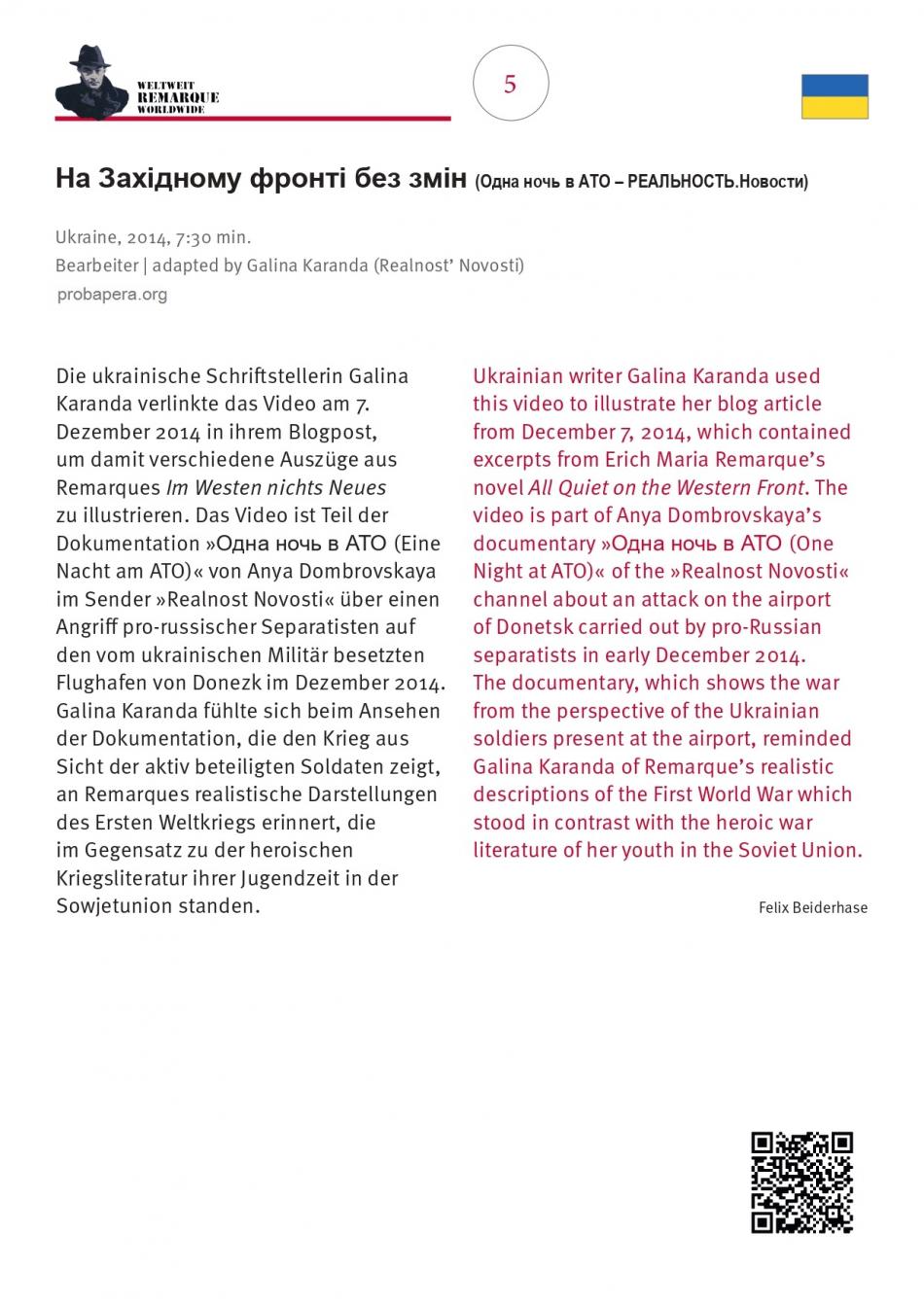 Враження від відео та від роману Ремарка не просто збіглися в часі. Для мене очевидно, що це – одне і те ж. Це – війна з середини, війна без прикрас, війна очима її учасників. В мене виникло бажання поділитися своїми відчуттями. Саме тому я опублікувала уривок з роману на сайті Проба Пера, проілюструвавши його цим відео.