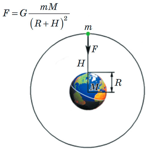 Сила тяжіння, яка діє на космічний корабель, залежить від відстані R + H між кораблем і центром Землі.