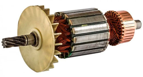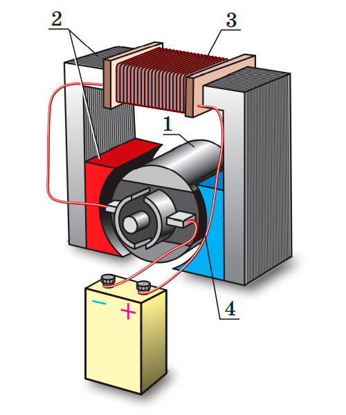 1 — ротор (рухома частина); 2 — статор (нерухома частина); 3 — обмотка статора; 4 — колектор.