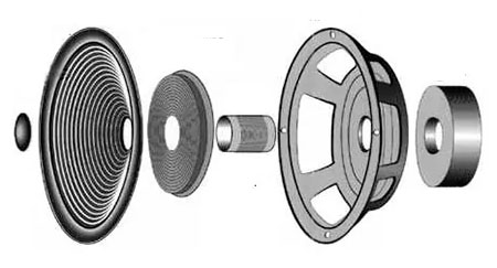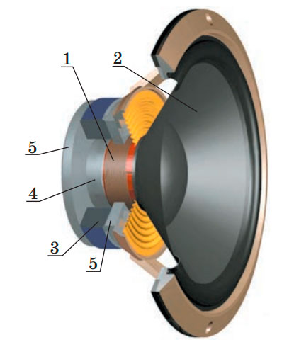 1 — звукова котушка; 2 — дифузор; 3 — постійний кільцевий магніт; 4 — керн; 5 — фланці.