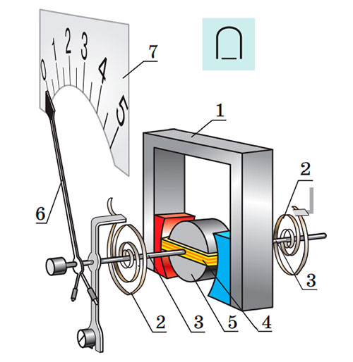 1 — постійний нерухомий магніт; 2 — спіральні пружини; 3 — півосі; 4 — рамка, жорстко закріплена на півосях; 5 — нерухоме осердя; 6 — стрілка; 7 — шкала.