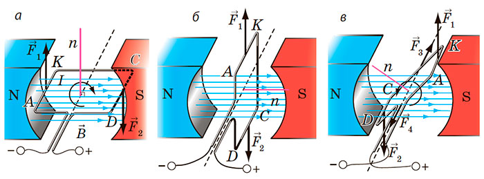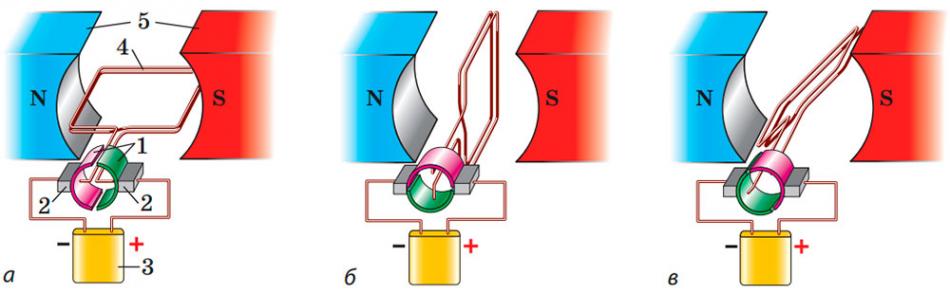 Унаслідок дії сил Ампера рамка зі струмом може обертатися в магнітному полі. Це явище використовують у роботі електродвигунів. Щоб забезпечити обертання рамки в одному напрямку, застосовують колектор.