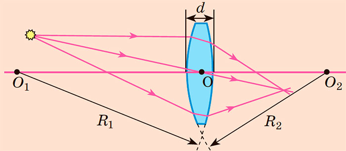O1O2 — головна оптична вісь лінзи; d — товщина лінзи; R1, R2 — радіуси сферичних поверхонь, які обмежують лінзу; O — оптичний центр лінзи.