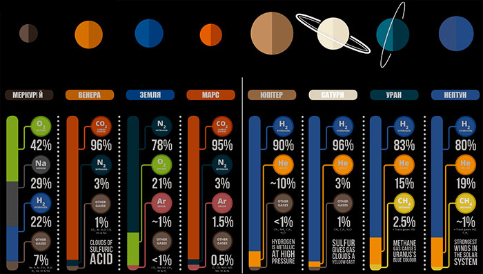 Нижче, на рисунку, ми можемо побачити склад атмосфери усіх планет нашої Сонячної системи. Але прояв цих даних найкраще розкажу саме розповідь про погоду на кожній із планет.