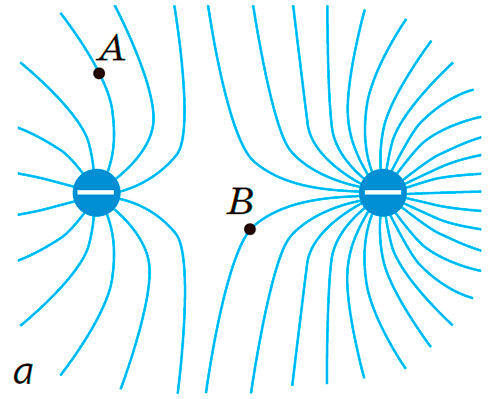 На рисунку (2, а) зображено лінії електричних полів, створених двома різними за модулем зарядами. Для кожного випадку визначте: 1) напрямок силових ліній; 2) який заряд більший за модулем; 3) напрямок сили, що діє на позитивний заряд, розташований у точці А; 4) напрямок сили, що діє на негативний заряд, розташований у точці В.