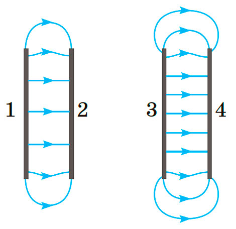 На рисунку зображено лінії електричного поля між двома парами заряджених пластин. Електричне поле між якими пластинами є більш інтенсивним? Визначте знак заряду кожної пластини.