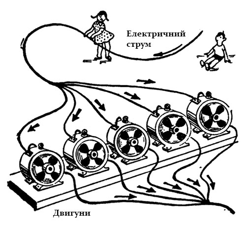 Коли електричний струм пускає в хід два таких електродвигуна, то величина струму, що протікає по головному проводу, буде в два рази більша, тобто дорівнюватиме 2.