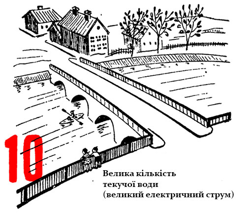 Уп`ятеро більший водяний потік може приводити в дію п`ять таких же млинів, величина водяного потоку дорівнює тепер 5. Перебіг водяного потоку в річці можна спостерігати, електричний же струм протікає по дротах невидимо для наших очей.