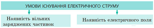 Для виникнення й існування електричного струму необхідна наявність вільних заряджених частинок та електричного поля, дія якого створює й підтримує їх напрямлений рух.