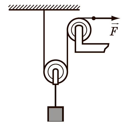 4. Яку силу F треба прикласти до вільного кінця мотузки (див. рисунок), щоб підняти вантаж масою 100 кг, якщо маса рухомого блока становить 2 кг? Вважайте, що тертя в осях відсутнє.