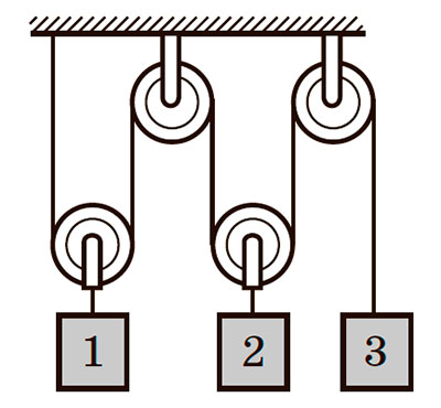 6. У системі на рисунку маса вантажу 3 дорівнює 1 кг, маса кожного блока — 100 г. Система зрівноважена та нерухома. Знайдіть маси вантажів 1 і 2. Масою мотузки і тертям у блоках знехтуйте.