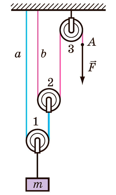 3. Вантаж піднімають за допомогою одного нерухомого і двох рухомих блоків (див. рисунок). Якою є маса вантажу і на скільки він підніметься, якщо під дією сили 75 Н вільний кінець мотузки опустити на 60 см?