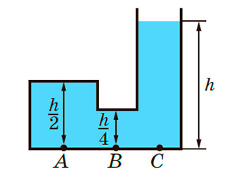 1. Тиск води на дно посудини в точці A дорівнює 200 Па (рисунок). Який тиск на дно створює вода в точці B? в точці C?