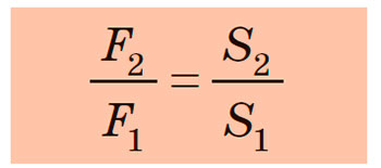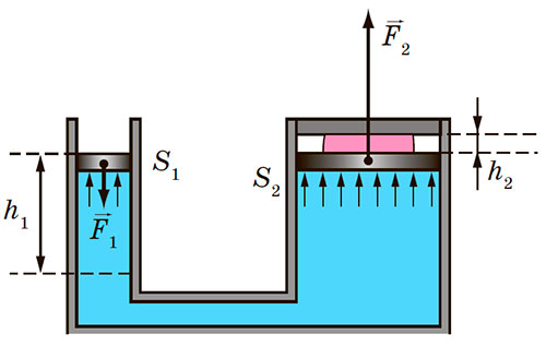 Сила, що діє з боку рідини на великий поршень, є більшою від сили, що діє на малий поршень, у стільки разів, у скільки разів площа великого поршня більша від площі малого: