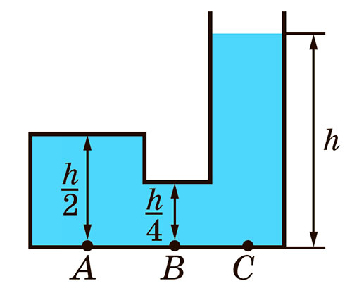 Тиск води на дно посудини в точці A дорівнює 200 Па (рисунок). Який тиск на дно створює вода в точці B? в точці C?