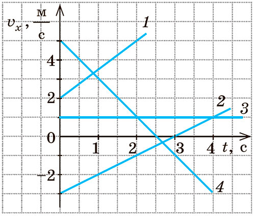 8. На рисунку подано графіки залежності vx(t) для чотирьох тіл. Для кожного тіла запишіть рівняння проекції швидкості руху, побудуйте графік залежності ax(t).
