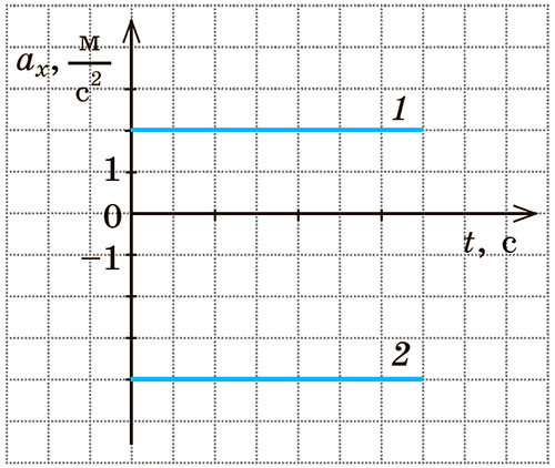 7. На рисунку подано графіки залежності ax(t) для двох тіл. Для кожного тіла запишіть рівняння залежності vx(t) і побудуйте графік цієї залежності, якщо v01x=−4 м/с, v02x=8 м/с.