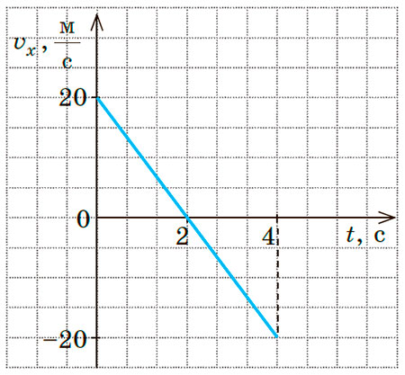 5. На рисунку подано графік проекції швидкості руху для деякого тіла. Визначте шлях і переміщення тіла протягом 4 с від початку відліку часу. Запишіть рівняння координати, якщо в момент часу t=0 тіло було в точці з координатою –20 м.