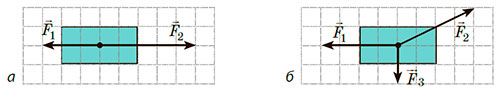 6. На рисунку зображено два тіла та сили, що діють на них (1 клітинка — 1 Н). Знайдіть напрямок і модуль рівнодійної сил, що діють на кожне тіло.